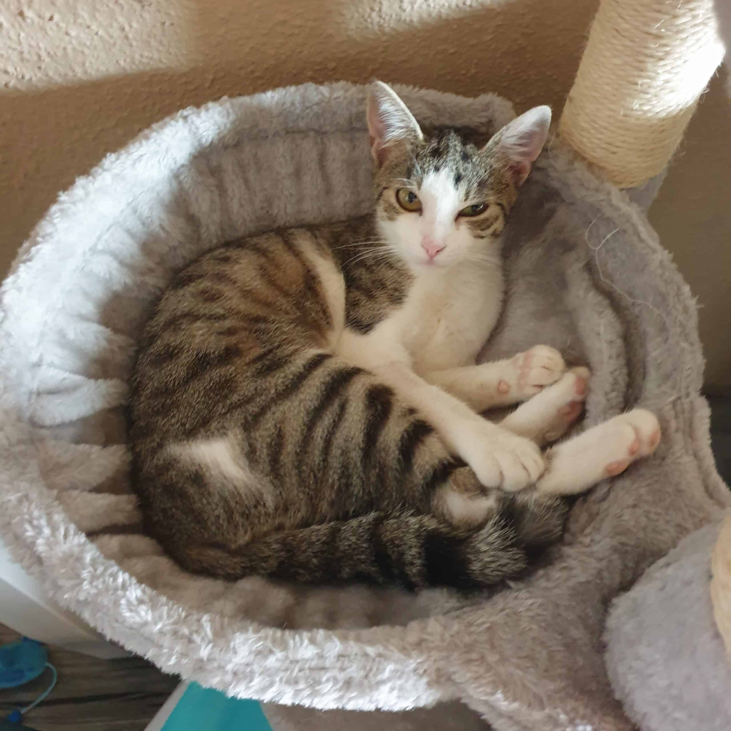 Die tapfere kleine Kätzin erholte sich schnell und zeigte nun ihr verschmustes und freundliches Wesen. Sie atmete wieder normal, hatte guten Appetit und nahm deutlich zu. Auch zum Spielen hatte sie Lust und wir merkten bald ihre Langeweile im Tierheimzimmer – höchste Zeit für ihren Auszug!